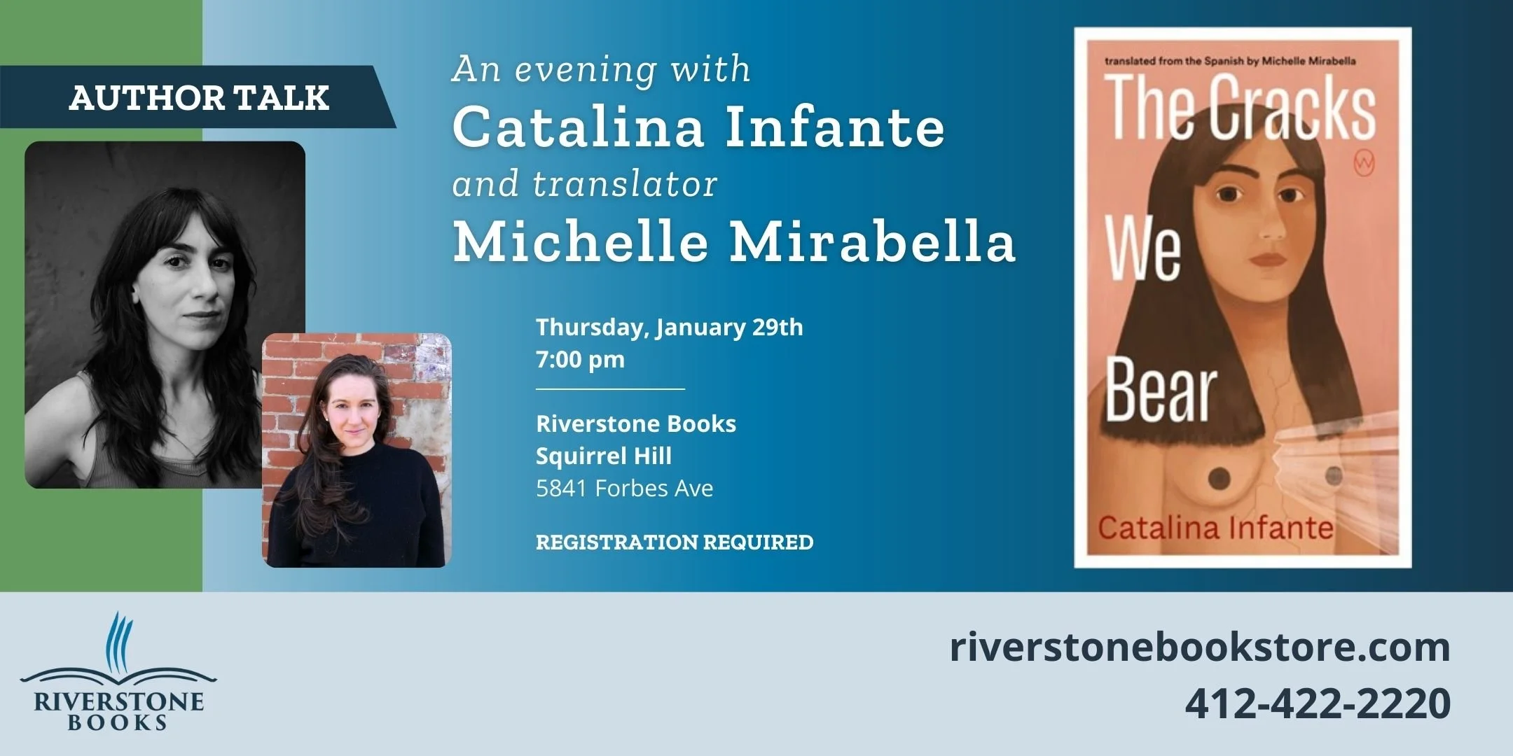 Join us for a talk on THE CRACKS WE BEAR by Catalina Infante! She will join us via Zoom and we will have the translator, Michelle Mirabella, in person. We will begin the evening with translator only questions, with the author joining us at 7:30p. Following the conversation, we will have Q&A with the audience. The translator will be available to sign books, if desired. After reserving your spot, you will be able to submit a question you have for the author.