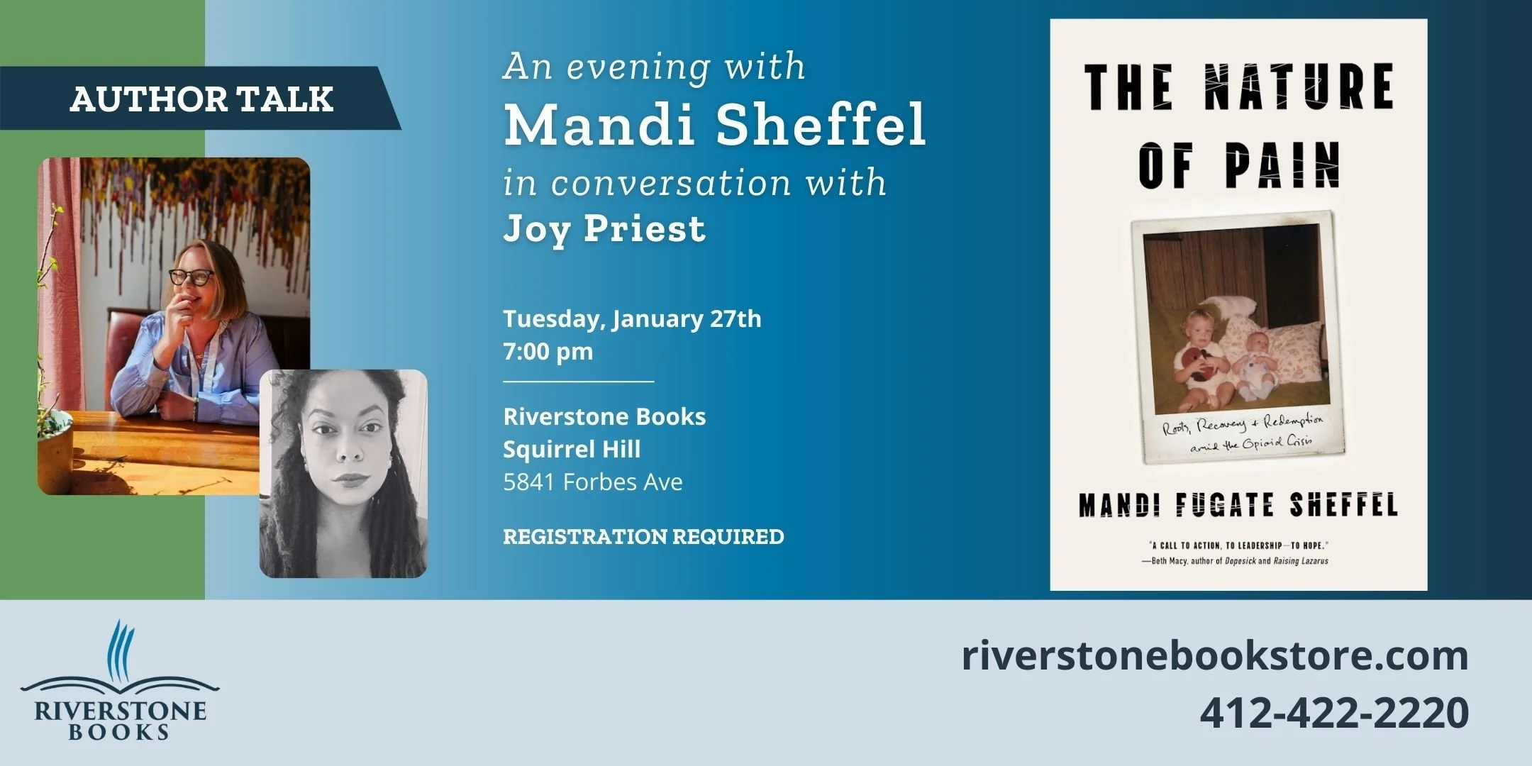 Author Mandi Sheffel joins us to talk about her book, The Nature of Pain. She will be joined in conversation by Joy Priest. Following the talk, there will be time for Q&A with the audience and book signing.